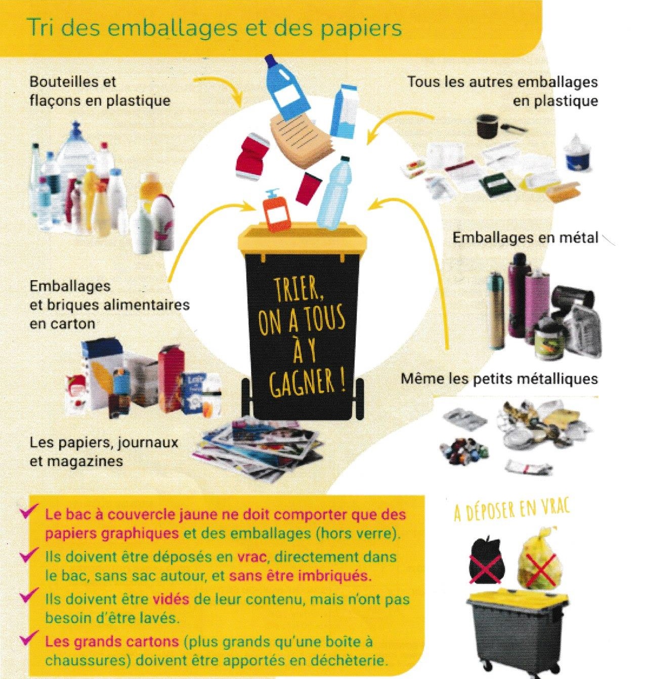 Pour que nos emballages soient recyclés, trions-les sans les emboîter ! En vrac, pêle-mêle directement dans le bac jaune ! Pour gagner de la place dans le bac de tri, on peut écraser, aplatir ou compresser nos emballages. En revanche, on ne doit pas les emboîter ou les imbriquer au risque de compromettre leur recyclage. Explications: