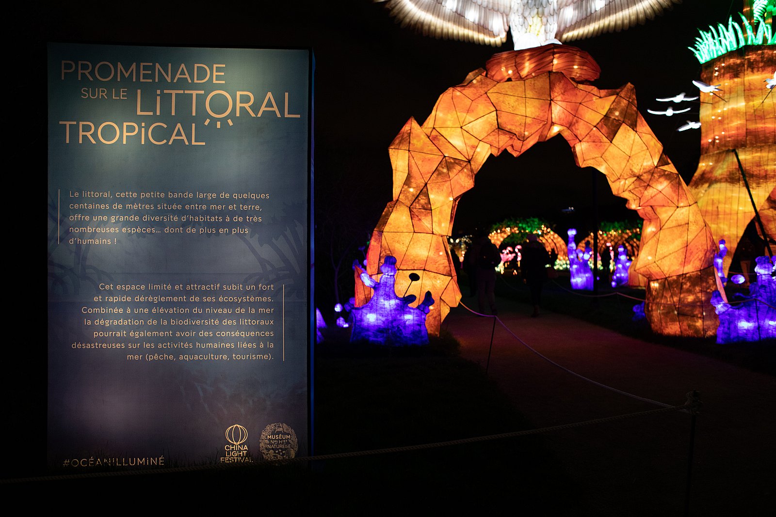 Océan en voie d’illumination proposait aux visiteurs de plonger dans l’immensité des océans, à la découverte de formes de vie majestueuses, fascinantes, parfois surprenantes. 50 tableaux et des centaines de structures lumineuses monumentales étaient à découvrir au fil d’un parcours mettant en scène quatre milieux marins.— Ocean en Illumination invited visitors to dive into the vastness of the oceans, to discover majestic, fascinating and sometimes surprising life forms. 50 paintings and hundreds of monumental light structures were to be discovered along a route depicting four marine environments.